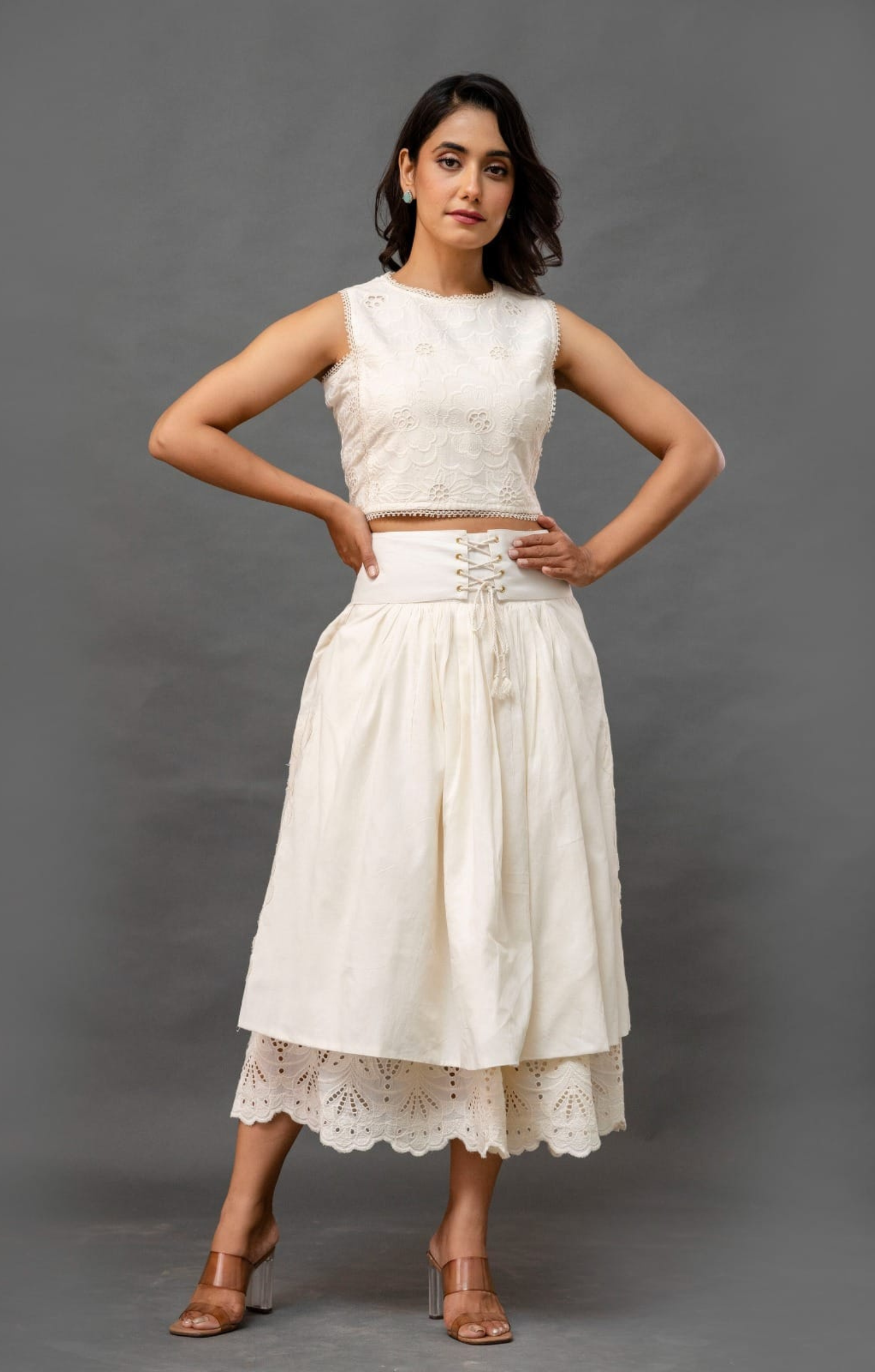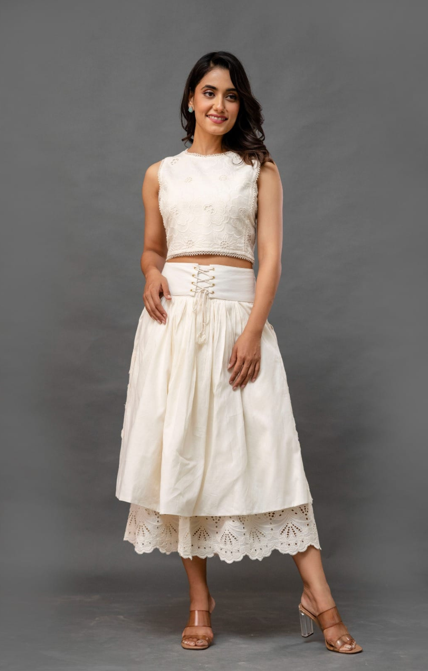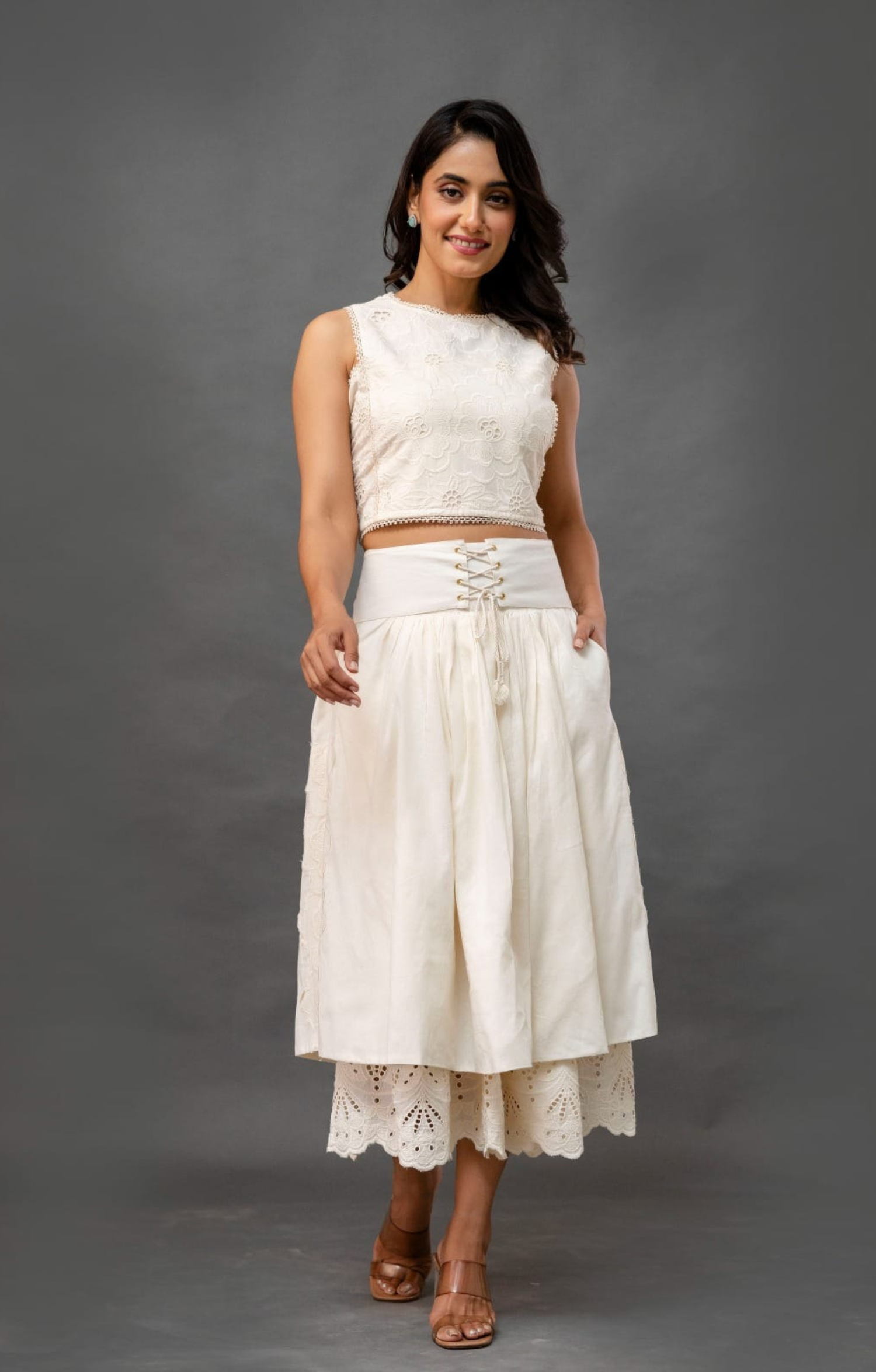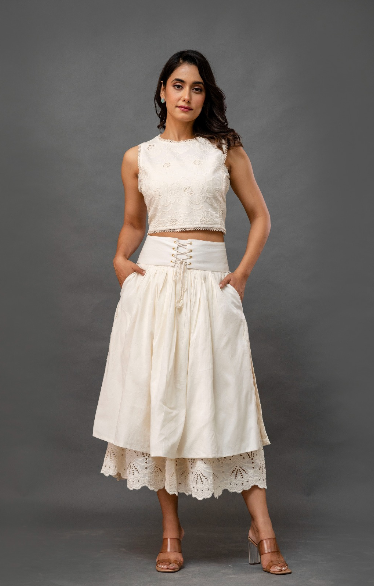 The sleeveless crop top is crafted in delicate floral lace, detailed with subtle laced edges. It pairs beautifully with a high-waisted flared skirt featuring a statement tie-up front and side pockets for comfort. The layered hemline with intricate details adds a romantic finish.