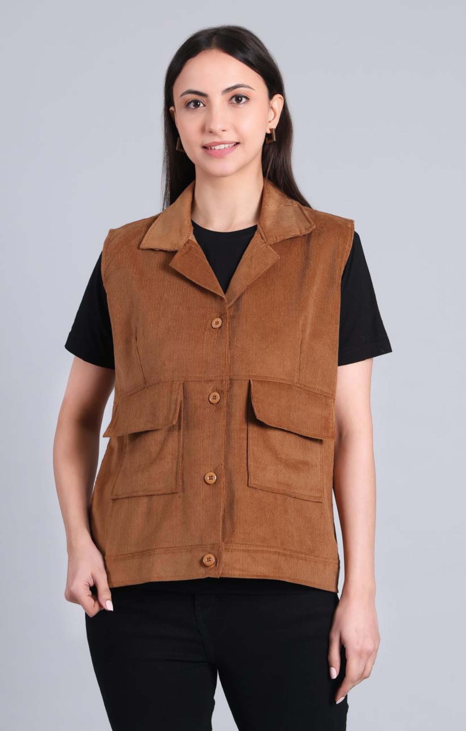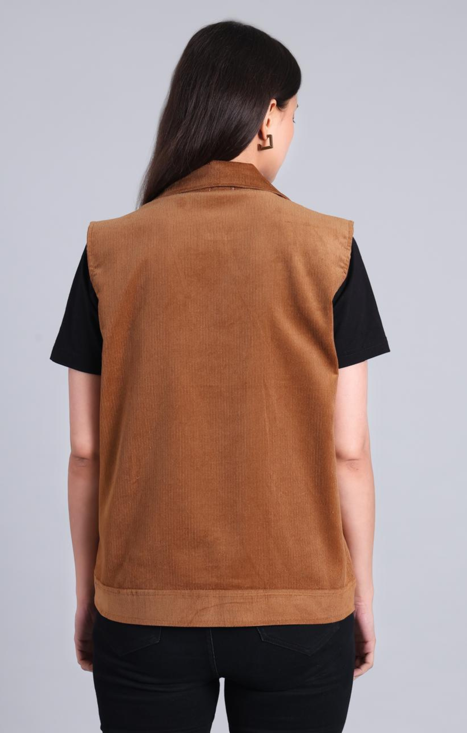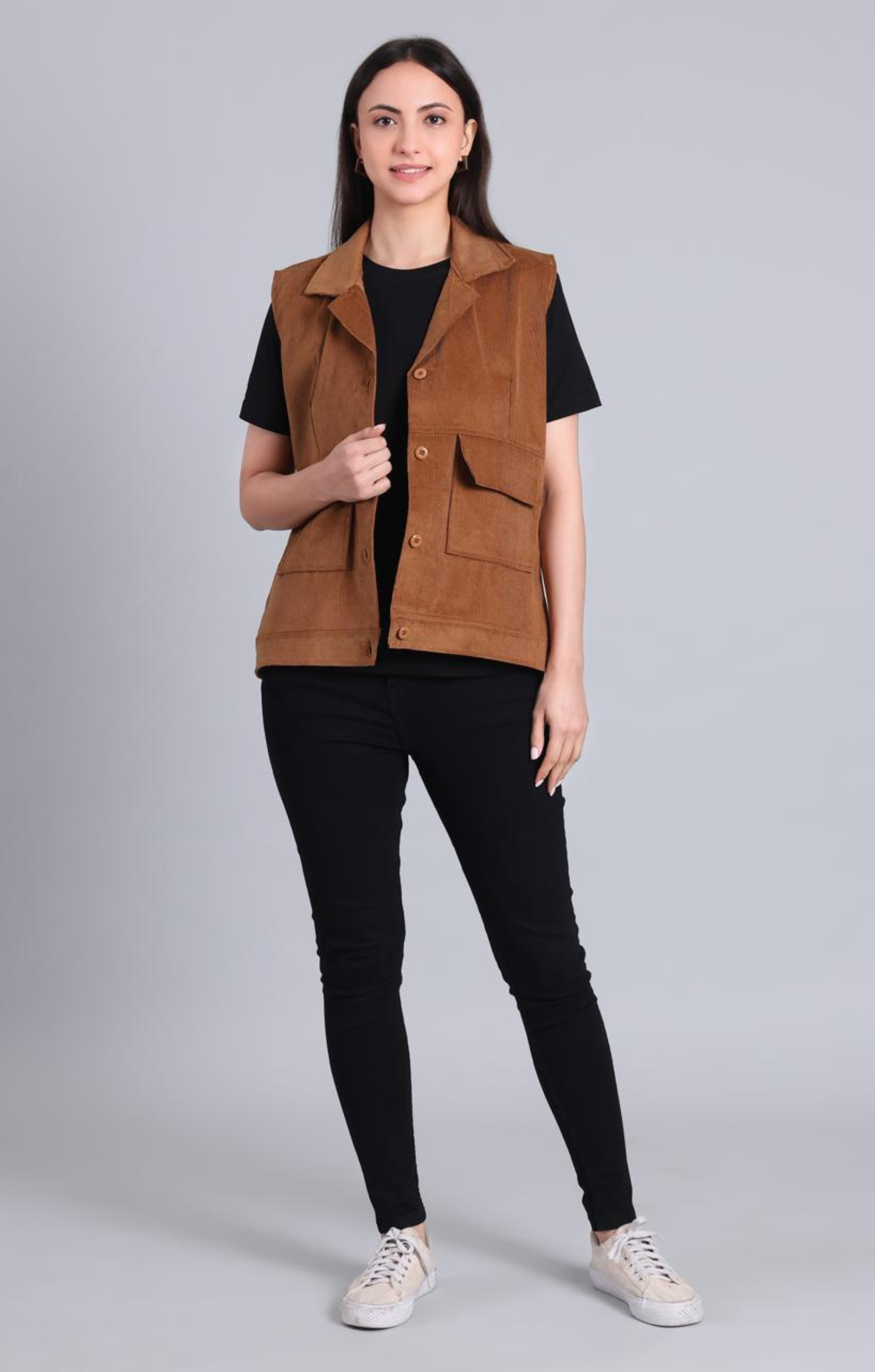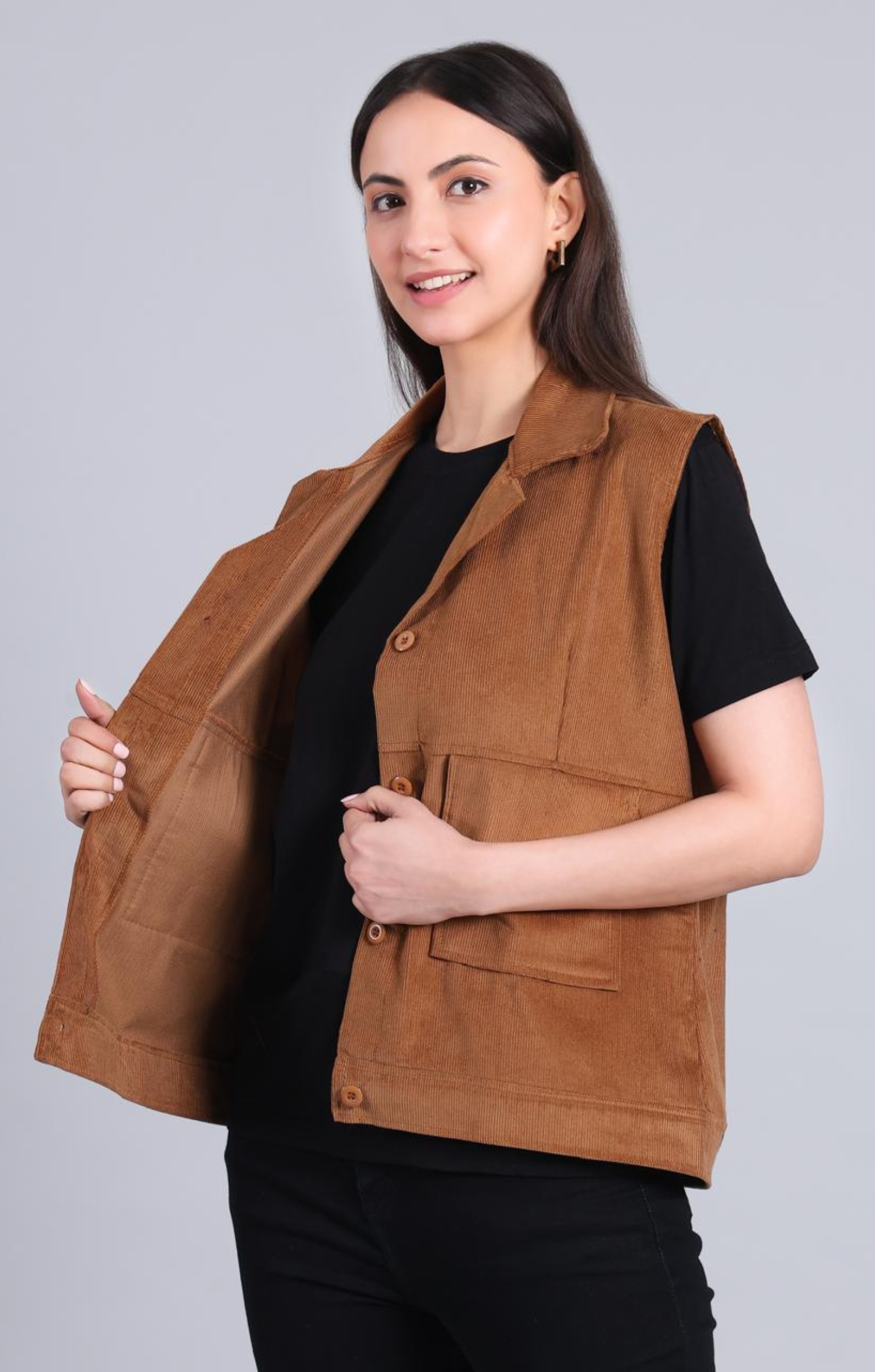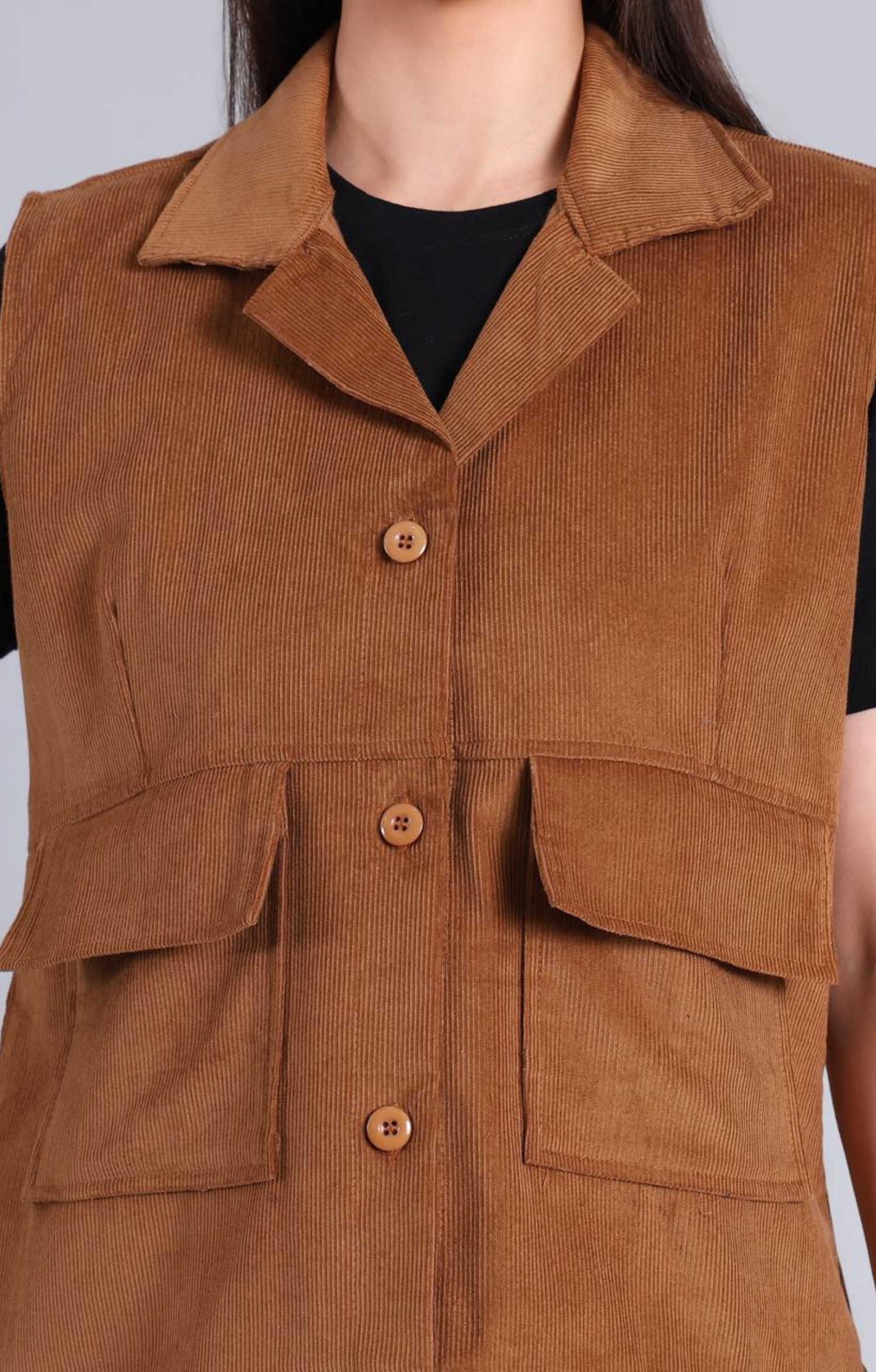 A sleeveless gilet crafted in soft corduroy, designed for effortless layering. Featuring a structured silhouette with a classic collar, button-front closure, and functional patch pockets, it balances utility with understated elegance. Easy to style across seasons, from workdays to off-duty moments.
