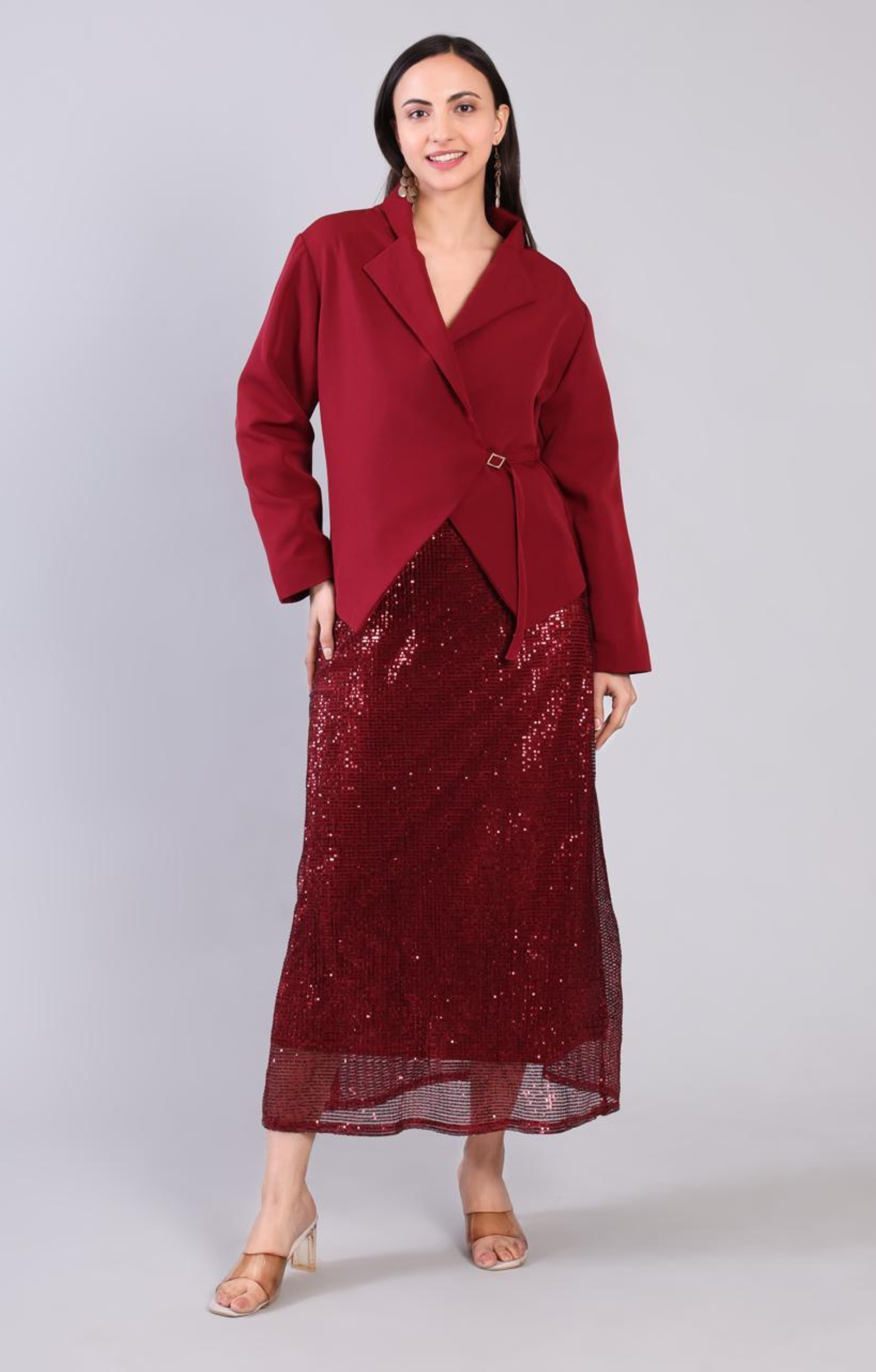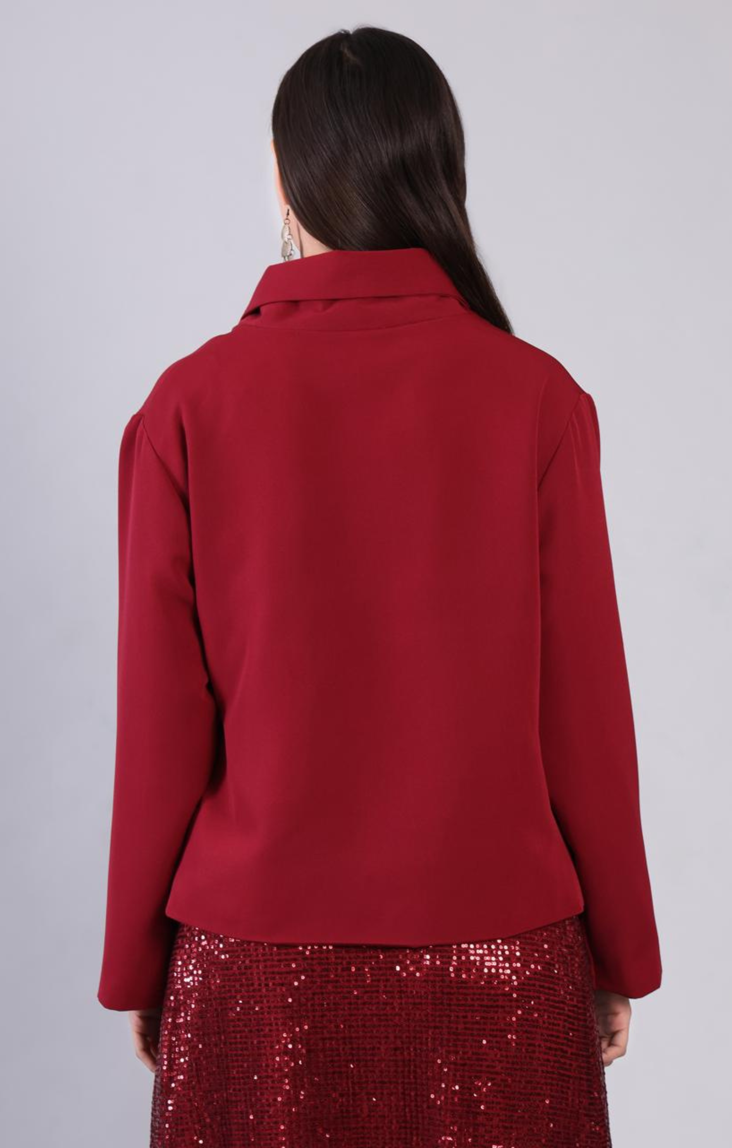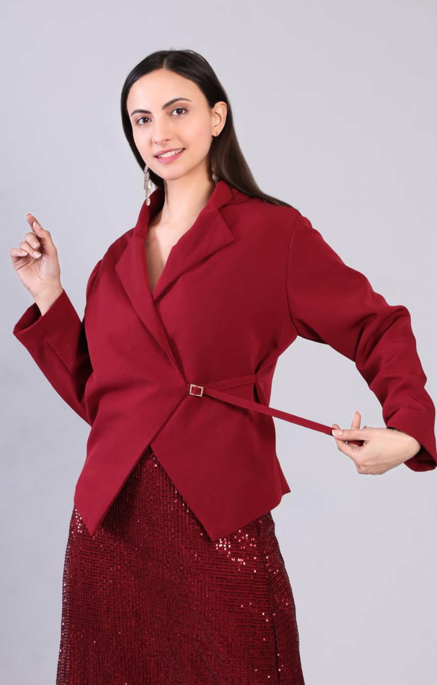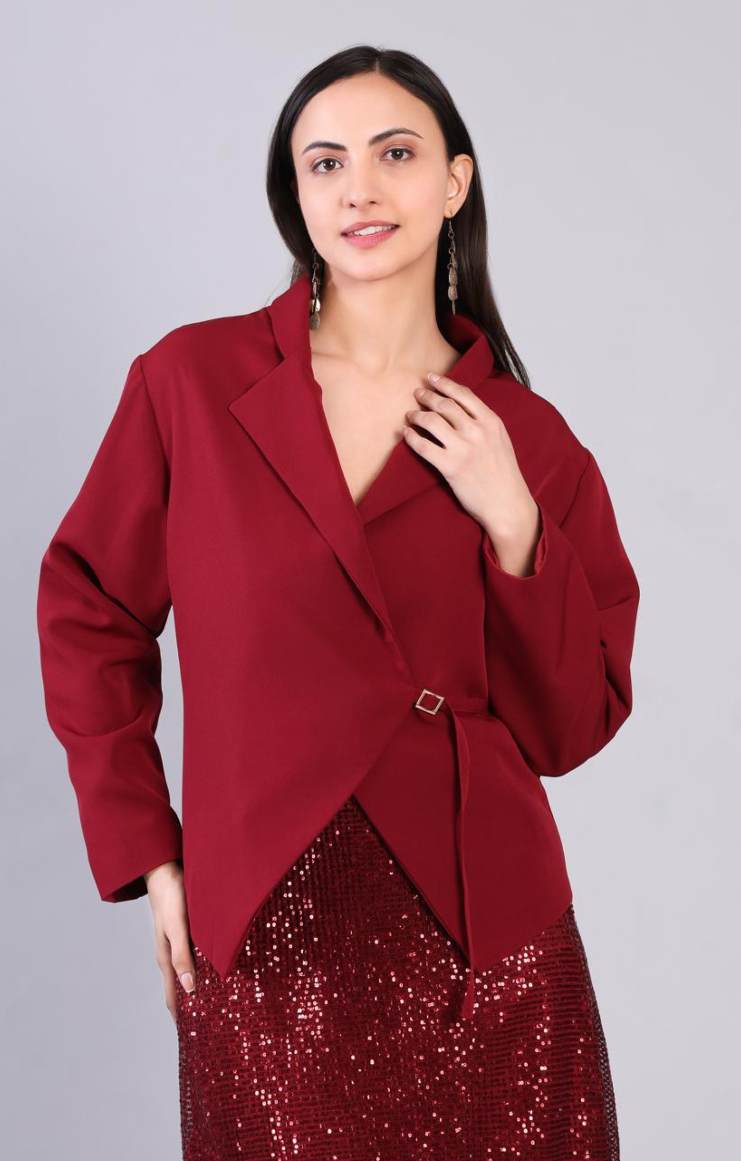 Crimson wrap-style blazer in banana crepe with a relaxed fit and full sleeves. Style with nude heels, minimal jewellery, and a bold lip for elegance.