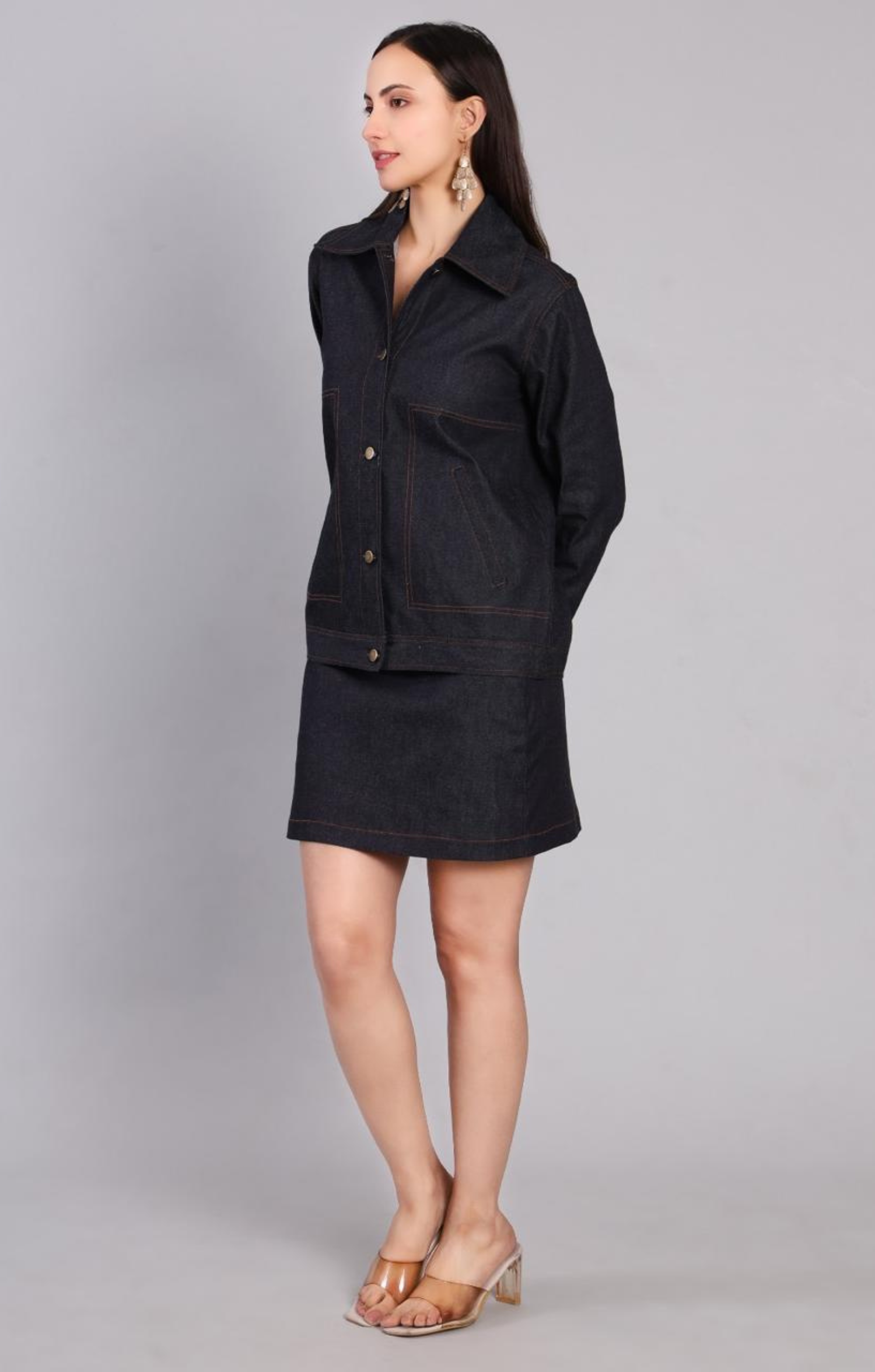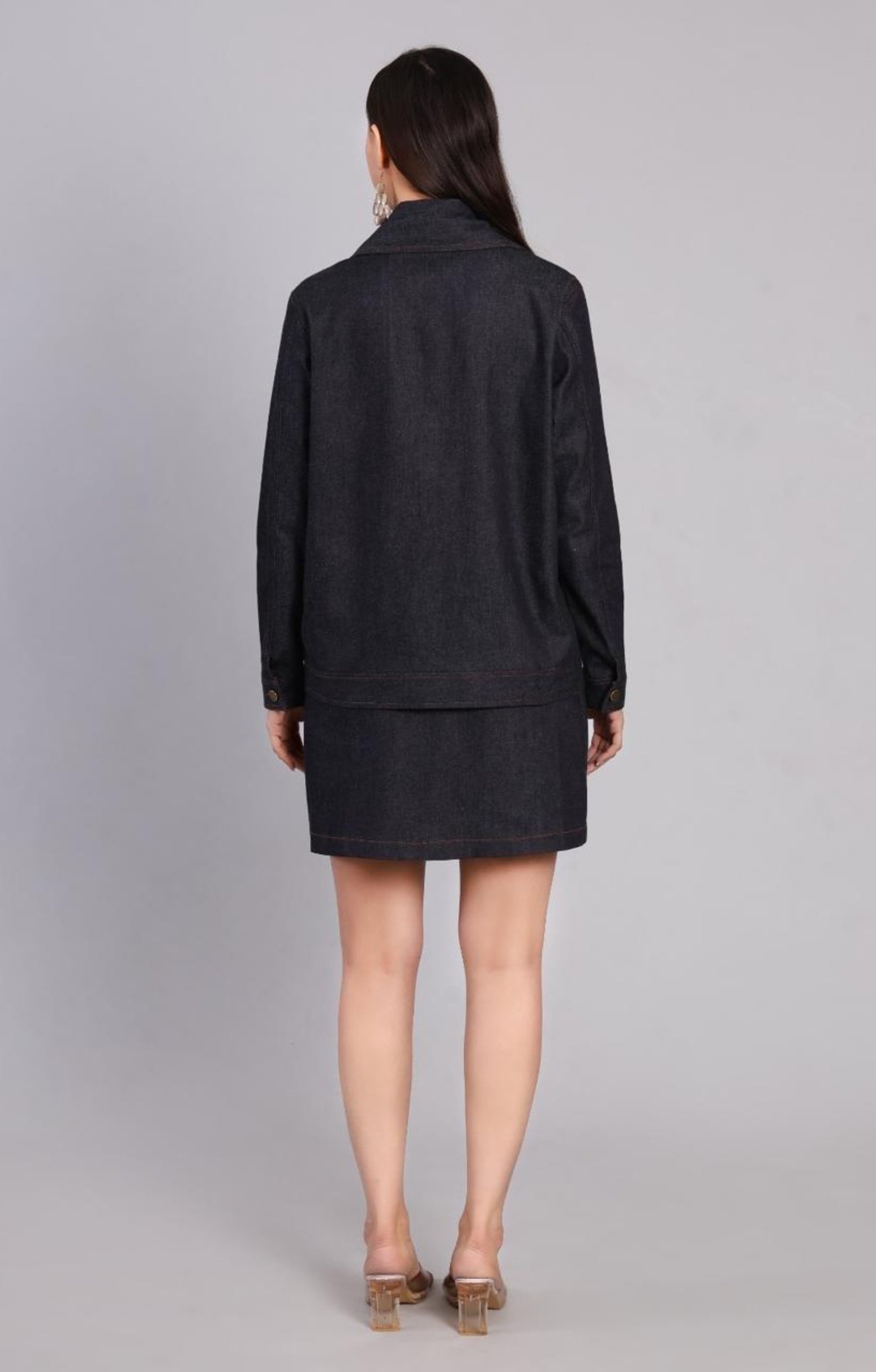 A structured dark blue denim jacket paired with a matching skirt, finished with clean lines, contrast stitching, and a polished, modern silhouette. Quietly powerful and effortlessly refined