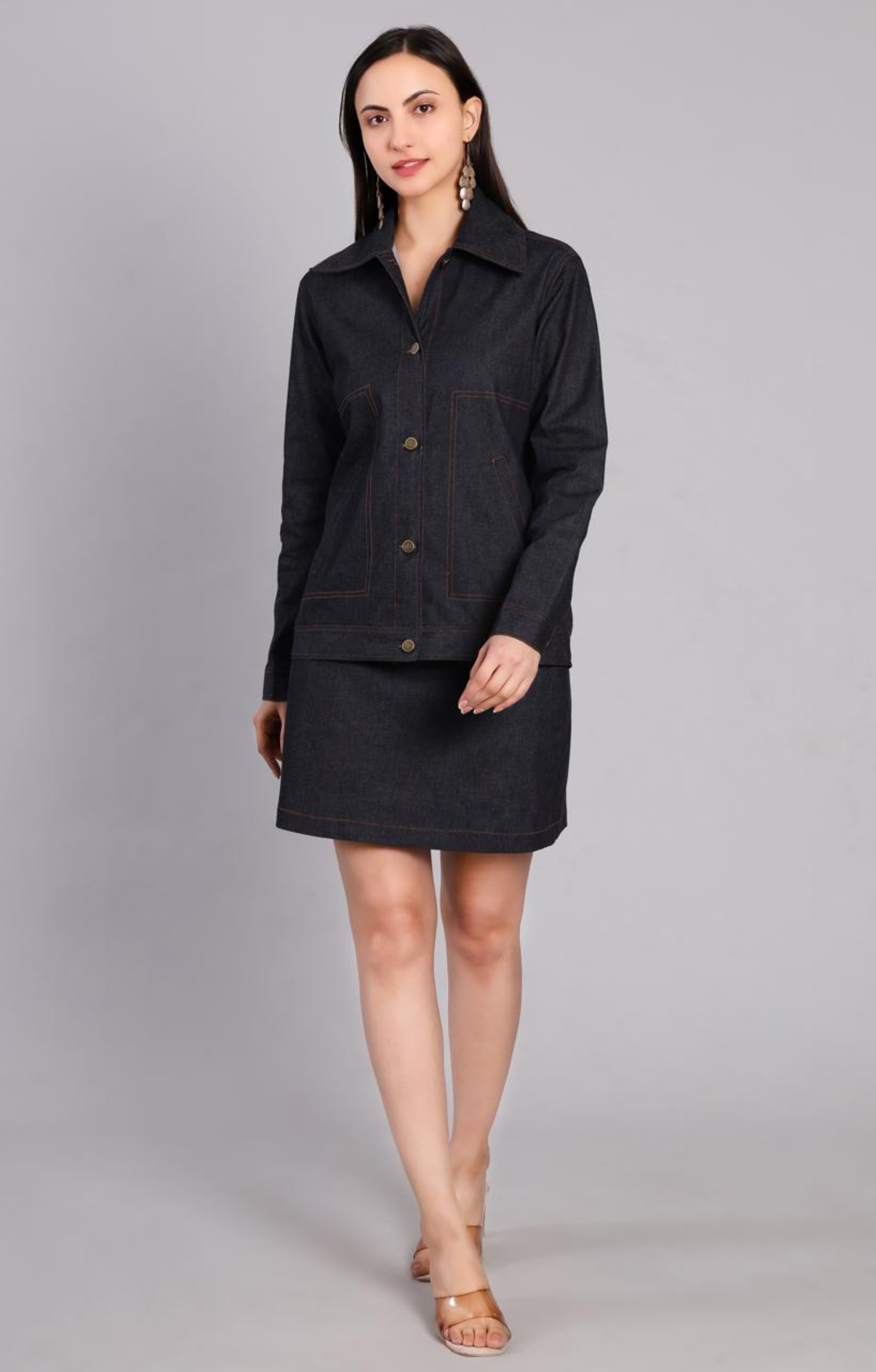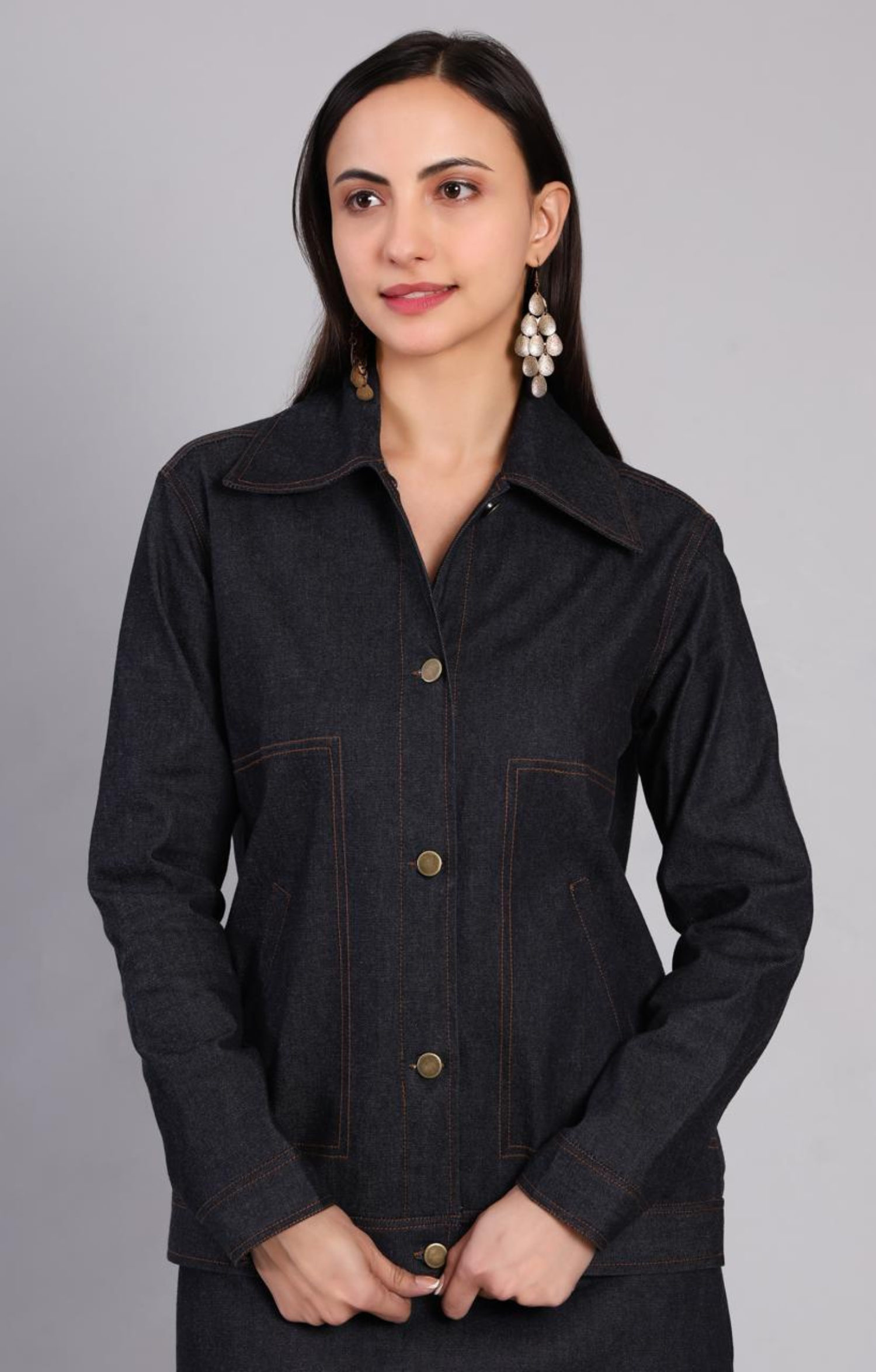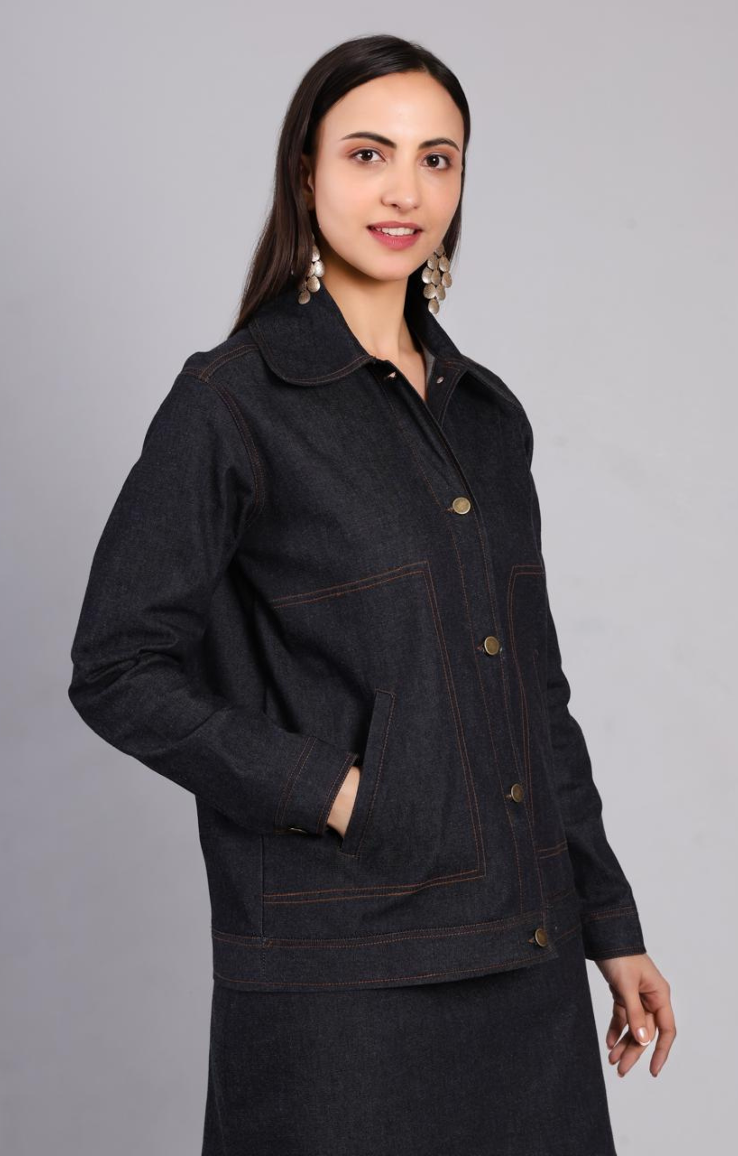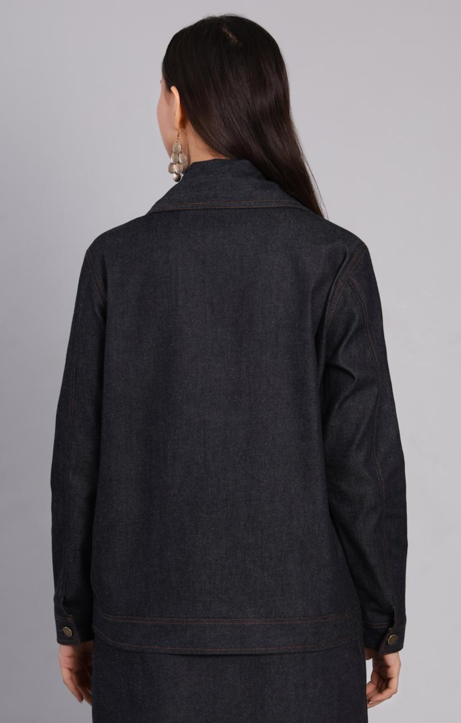 A structured dark blue denim jacket finished with clean lines, contrast stitching, and a polished, modern silhouette. Quietly powerful and effortlessly refined
