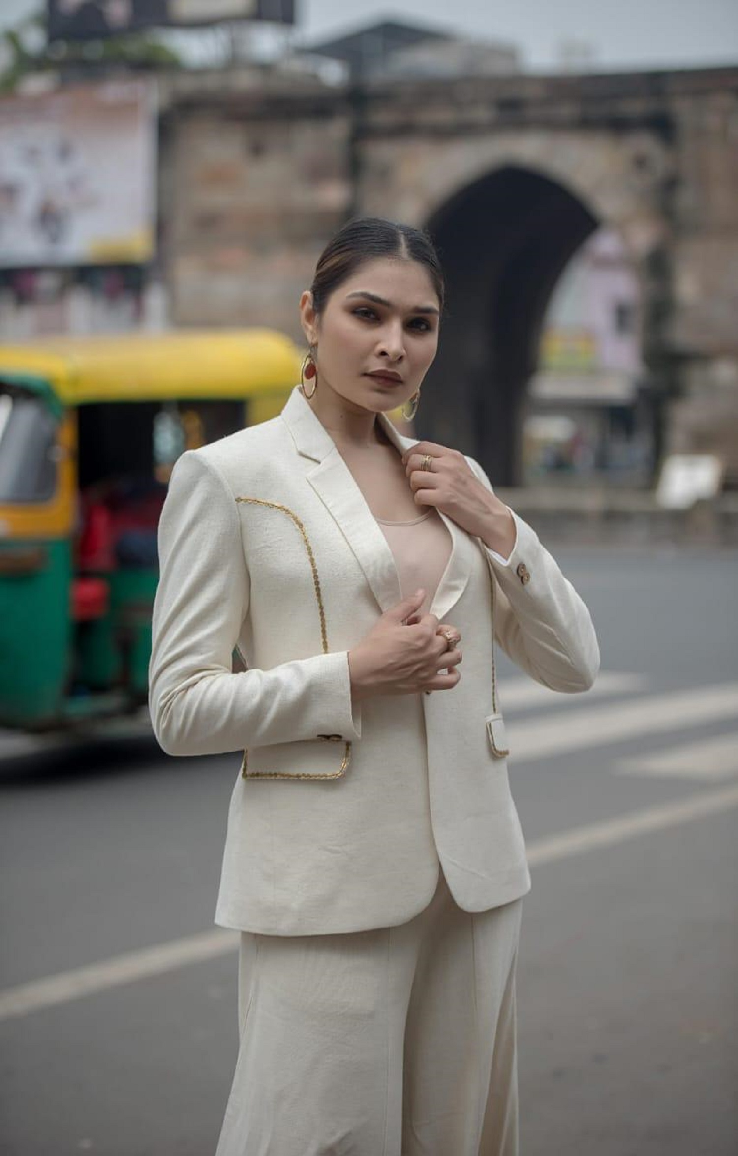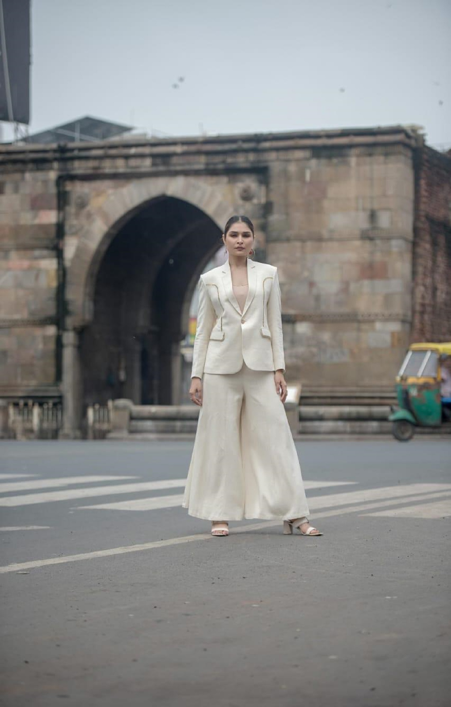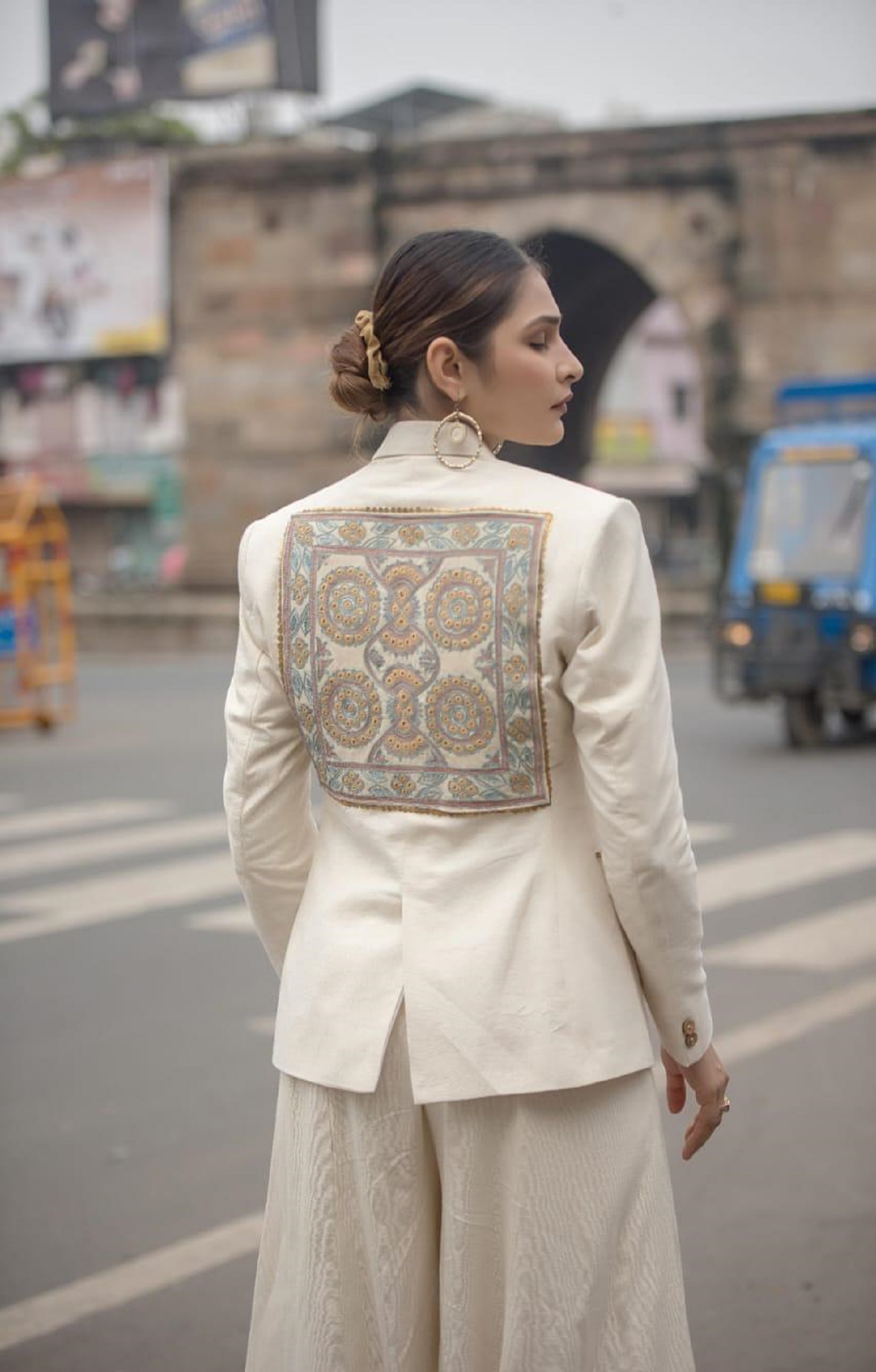 An ivory linen coord set , with artisanal charm . Kutchi work at the back of the blazer . Paired with linen flowy culottes.