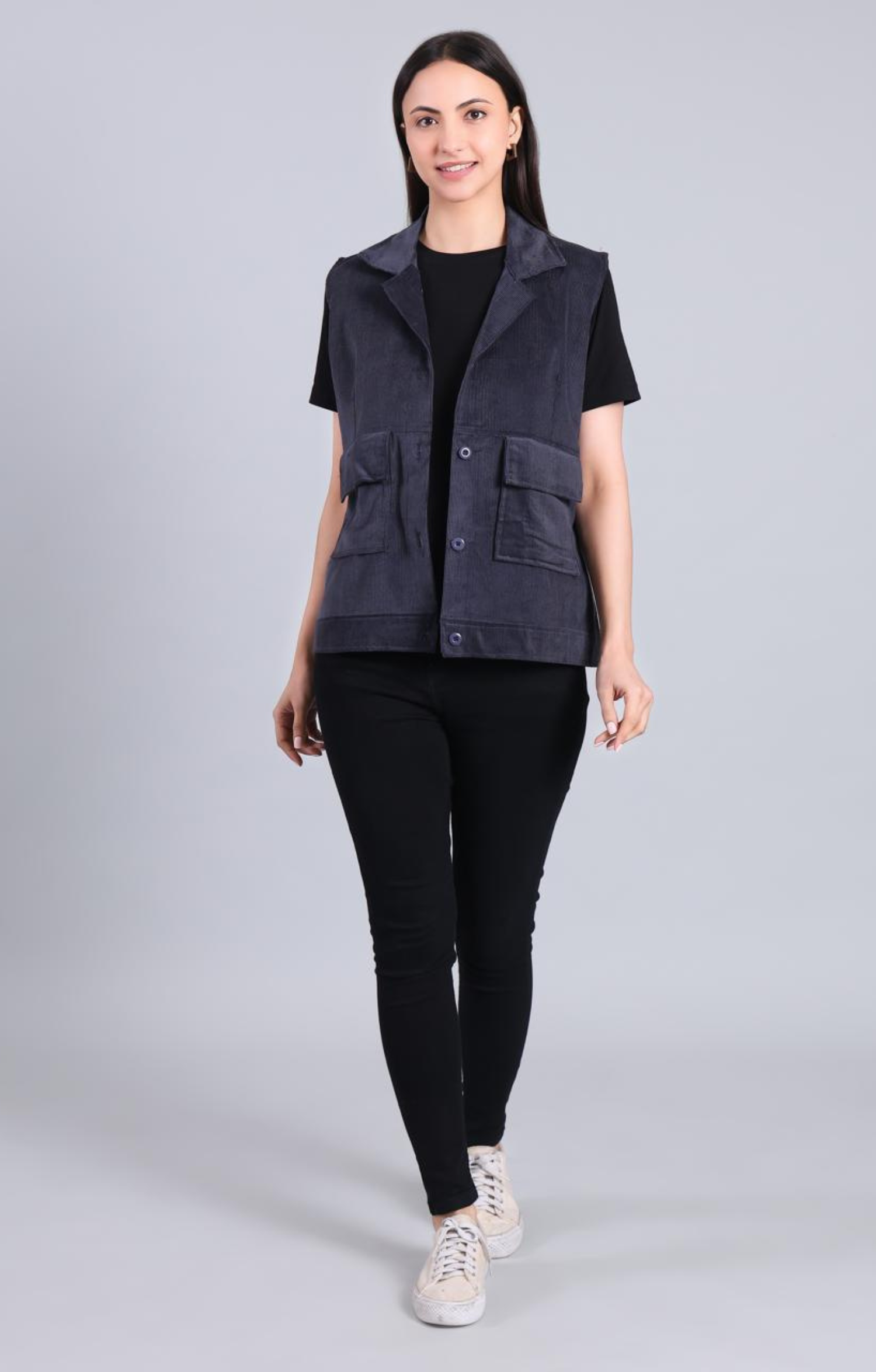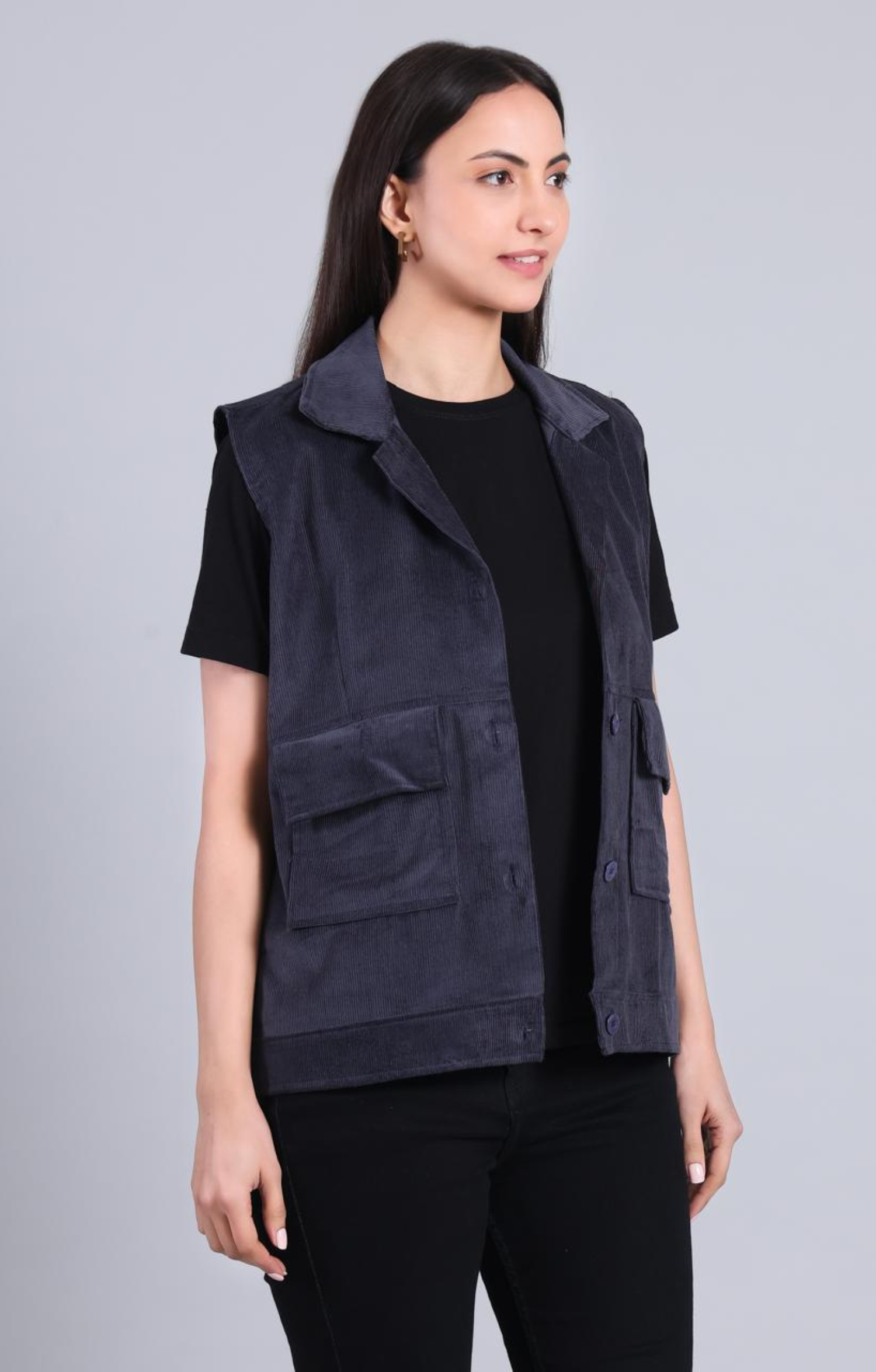 A sleeveless gilet crafted in soft corduroy, designed for effortless layering. Featuring a structured silhouette with a classic collar, button-front closure, and functional patch pockets, it balances utility with understated elegance. Easy to style across seasons, from workdays to off-duty moments.