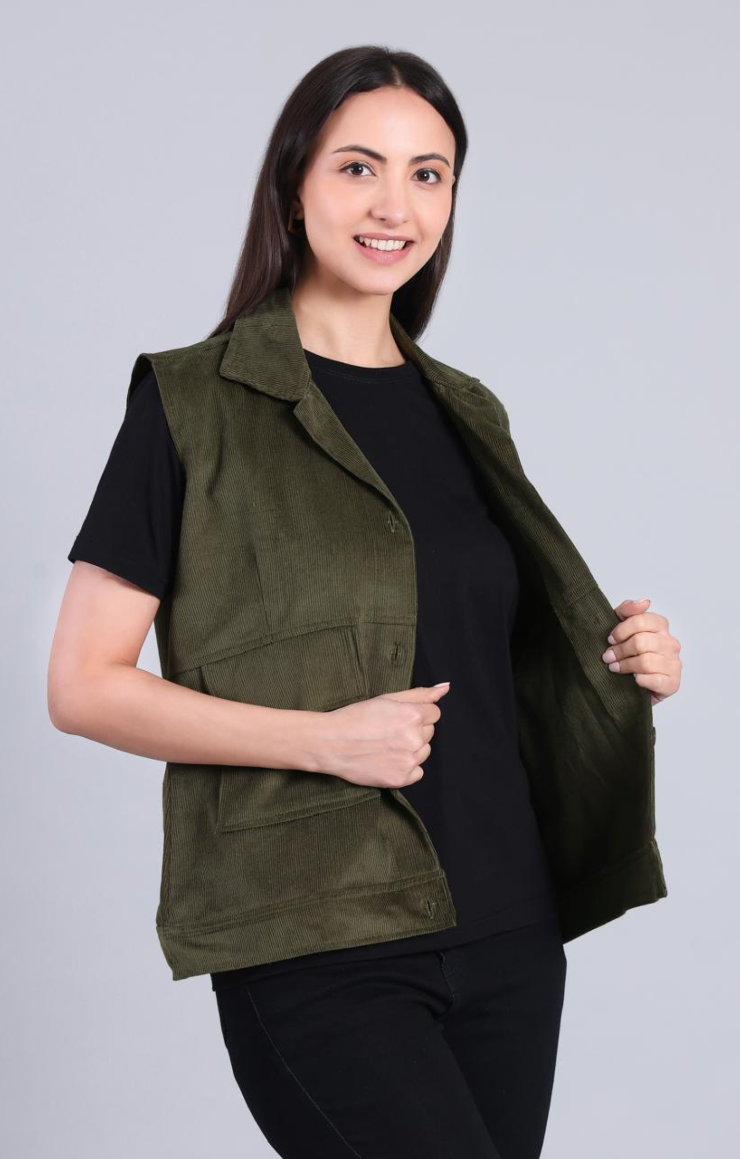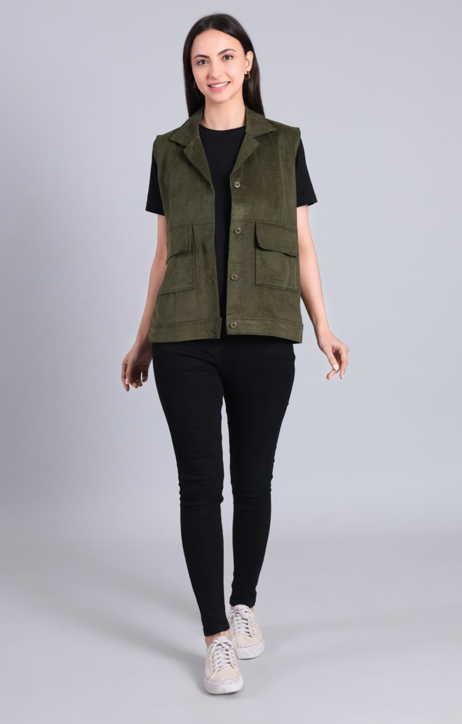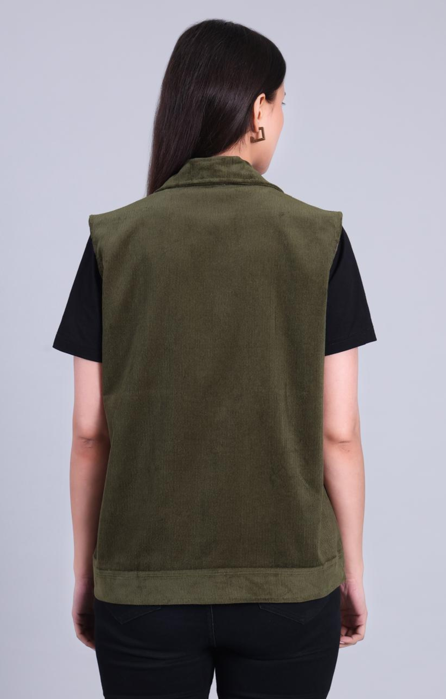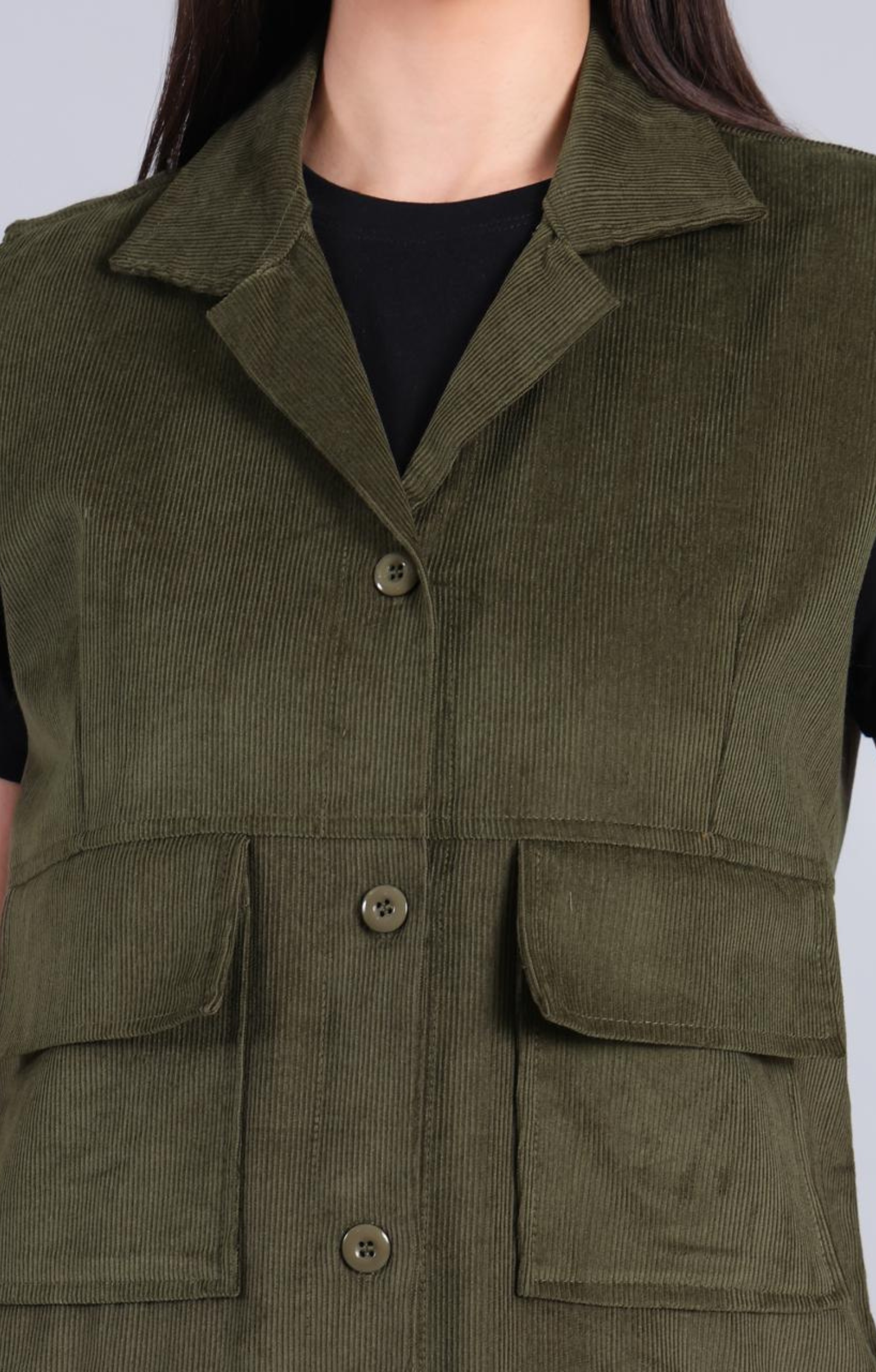 A sleeveless gilet crafted in soft corduroy, designed for effortless layering. Featuring a structured silhouette with a classic collar, button-front closure, and functional patch pockets, it balances utility with understated elegance. Easy to style across seasons, from workdays to off-duty moments.