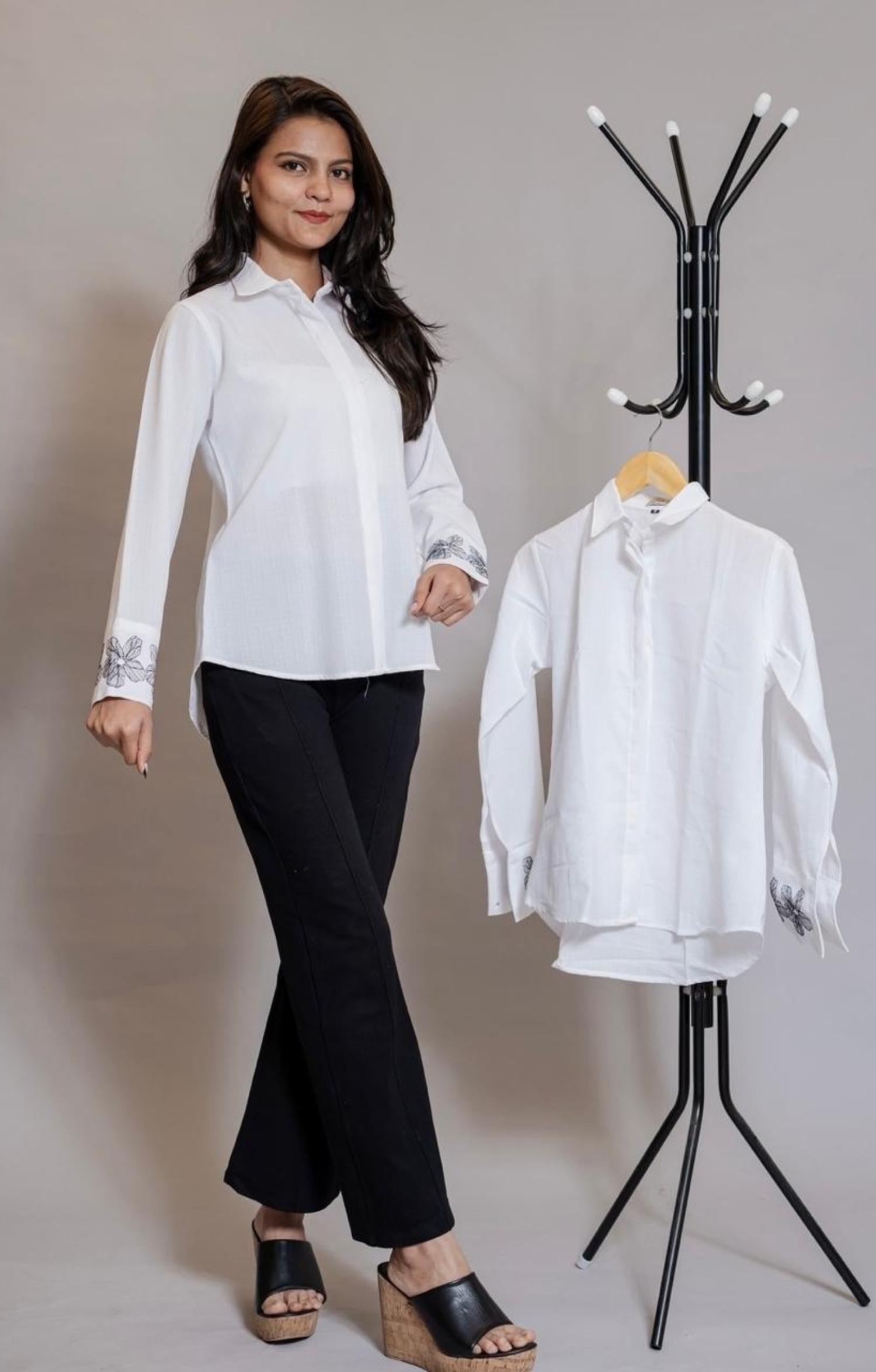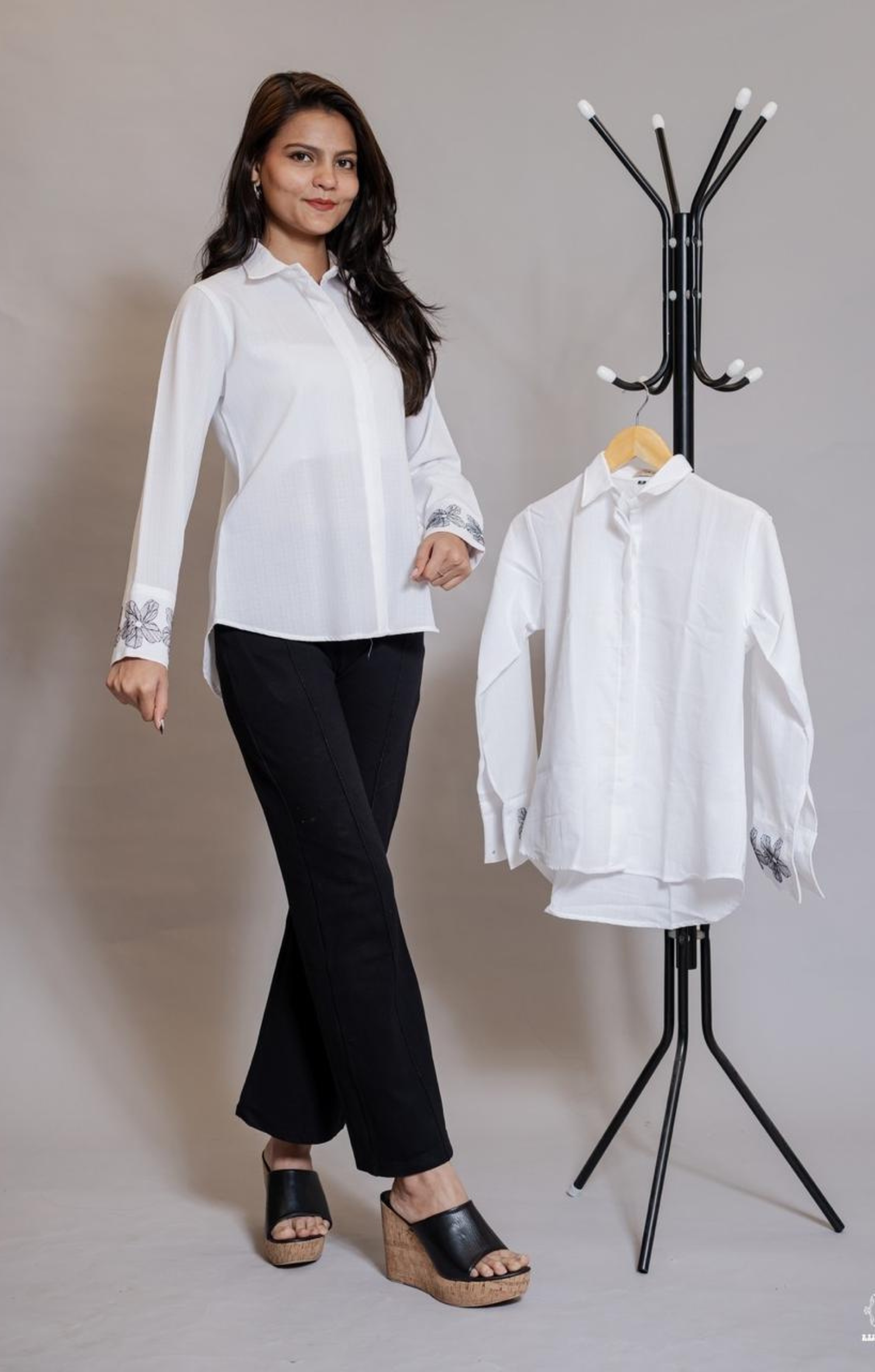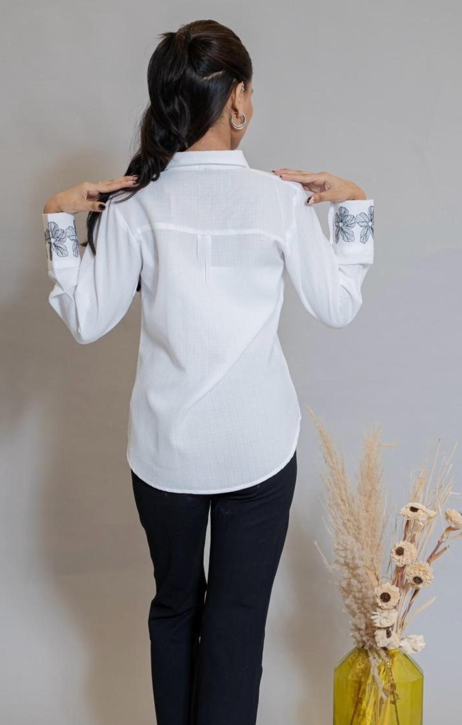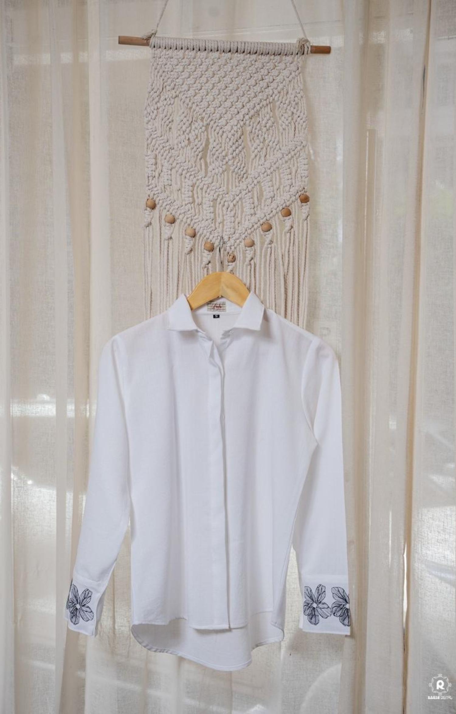 A breezy Linen blend shirt, woven with subtle sheen and grace, with floral embroidery in the cuff of sleeves , where tradition meets effortless modernity.